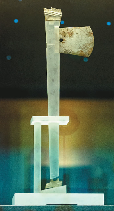 玉钺是良渚文化中军权和神权的象征,相当于权杖。一套完整的玉钺由钺身、钺杖、钺瑁(杖冠饰)、钺镦(杖端饰)组成。“这是瑶山遗址7号墓出土的玉钺组合。”叶素芬说,“有瑁有镦的良渚玉钺目前只发现7组,这里展示的便是其中一组,非常珍贵。”