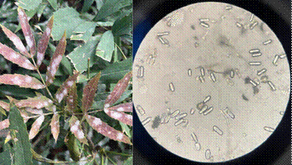 防治建议:(1)适当修剪:抽梢前剪除病枝,集中销毁;(2)化学防控:发病时可选用5%腈菌唑微乳剂800-1000倍液进行防治。(撰稿人:周涵宇)
