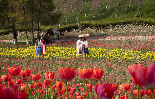 在景区的湿地花谷景点,放眼望去,黄色、粉色、红色的郁金香,花开正艳、娇艳欲滴。前来赏花的市民,徜徉在花海中,尽情感受着春日里浪漫的异国情调。大家纷纷拿出相机和手机,记录下这美丽难忘的时刻。市民李女士说,春天来了,到园博园来赏下花、打下卡。这些郁金香开得很好看,颜色品种也多,拍照很漂亮。
