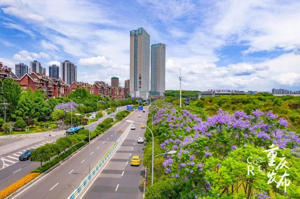两江新区庐山大道靠近重庆北站,作为重庆城市交通枢纽之一,是观赏蓝花楹的好地方。邹乐 摄 (重庆发布资料图片)