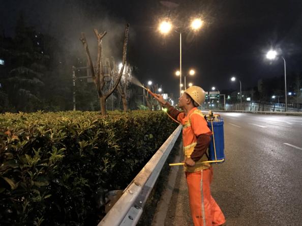 二是防病助生长。为保障土壤肥力,增强道路绿植生长势头,提高抗病能力,采取中分带水车喷施水溶肥、路侧节点撒施复合肥、草坪撒施尿素等多种方式进行追肥,同时根据植株不同的习性和易发病虫害,搭配使用不同肥料和除虫剂3425公斤,做到精准施肥、靶向防病。