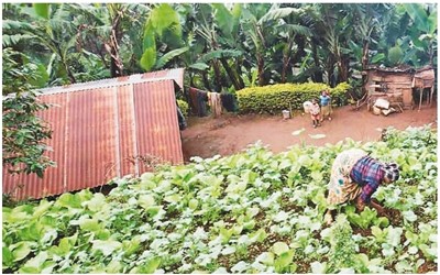 在坦桑尼亚“欣布韦朱基哈姆巴农林遗产地”中,最上层的植被结构由茂密的树木组成,提供树荫、药物、饲料、水果、薪柴和木材;林下种植多种香蕉,香蕉树下种植咖啡灌木,咖啡树下则种着多种蔬菜。图为当地部落的农民在采摘蔬菜。