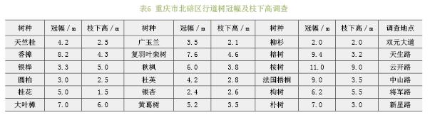 重庆夏季最高气温43℃,行道树的遮荫功能有重要意义。调查发现,桂花枝下高普遍不足,如双元大道的桂花枝下高仅1.5m,遮荫效果差,行人无法树下通行;银杏的冠幅普遍较小,如龙凤大道及碚峡路两侧银杏冠幅仅2.4m (表6)。从行道树的遮荫功能来看,桂花、银杏的冠幅、枝下高不足,遮荫功能存在缺陷,适宜作为观赏树种,不宜作为行道树大规模应用;榕树、黄葛树、天竺桂、法国梧桐枝下高在2.5~3.5m,枝下高与冠幅比例适宜,遮荫效果好,宜作骨干行道树树种 。