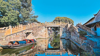 夕阳的余晖洒在宝珠桥上,乌篷船从拱形桥洞中悠然而过,河面荡起层层涟漪。几名身着汉服的姑娘在桥头观景、拍照,笑语连连。