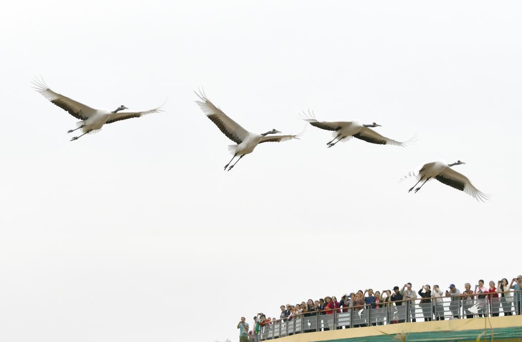 10月12日,一群丹顶鹤在东营黄河三角洲湿地飞翔。新华社记者徐速绘 摄