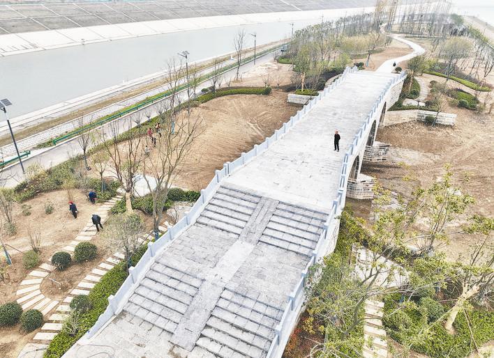 11月26日下午,记者来到引江济淮工程蜀山枢纽泵站的江心洲,带有古韵的三拱城西桥已经建成。为了还原历史风貌,此次城西桥引桥四角还复建了四口水井。