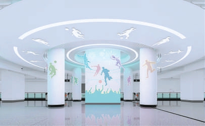 车站公共空间的艺术品设计与区域文化有机结合。例如,西坝河站的作品围绕坝河文化,从古代玉器中提取鱼的造型,与西坝河的装修空间融为一体,“鱼”也寓意着生活年年有余、美好富足。工人体育场站的艺术品设计取自工体足球比赛的场景元素,人物形象充满动感,与灯光配合后突显层次,营造出科技感与未来感。